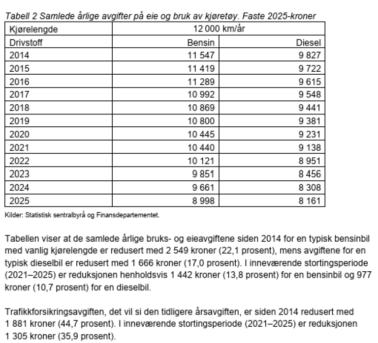 Under Vedum som finansminister fekk ein gjennomsnittleg bilist rundt 1000 kroner i reduserte avgifter årleg: